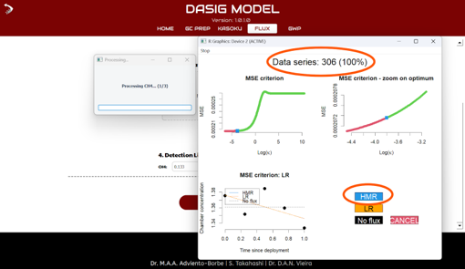The model automatically evaluates each time series using a number of quality thresholds, including R², DL compliance, and internal ratio checks to determine whether a linear regression or the extended HMR method is most appropriate. The optimal method is applied to compute the final Daily Flux for each chamber event. All computed fluxes are prepared for downstream processing and are used directly as inputs to the DASIG-GWP module for global warming potential assessment.